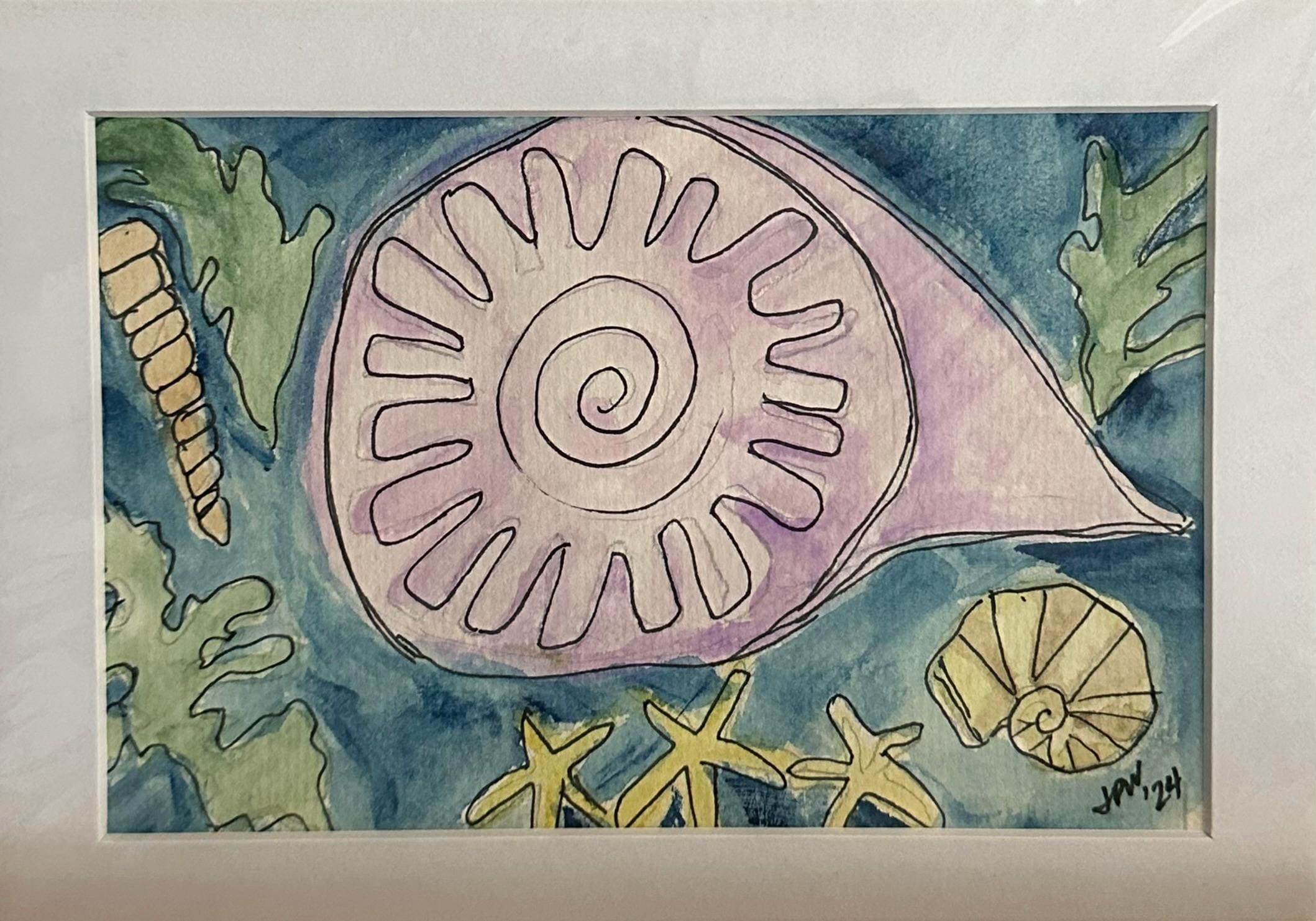 Pink Conch Shell with 3 Starfish - Original watercolor print