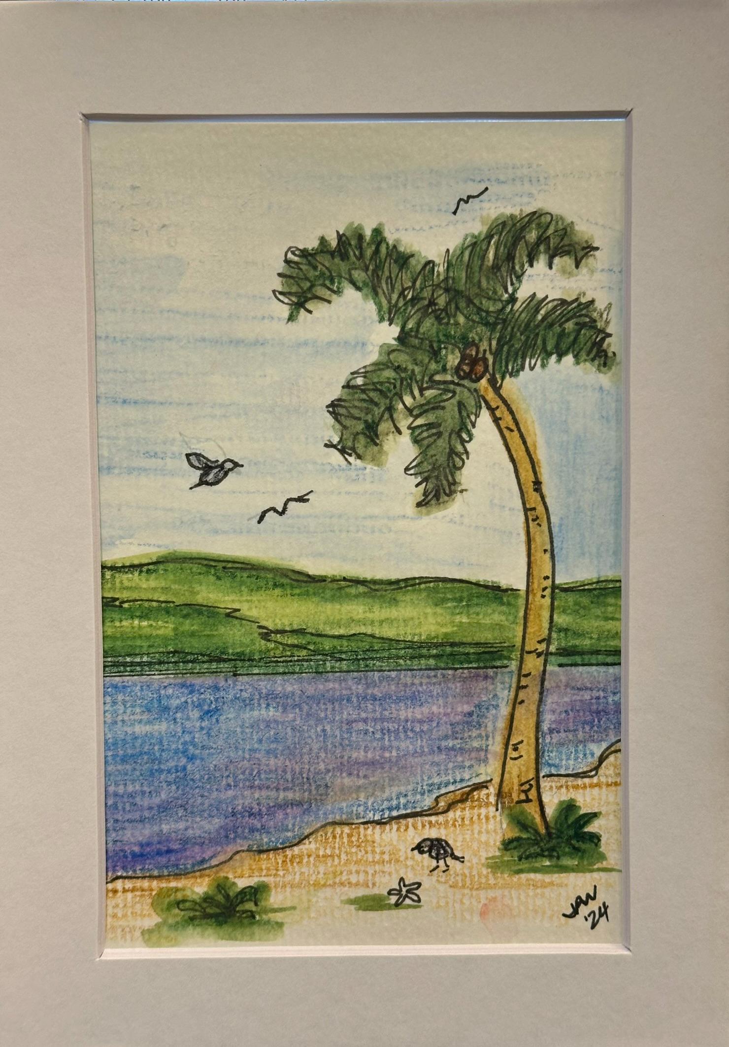 Beach with Palm, 1 shorebird & hills in BG - Original watercolor print